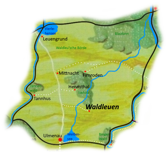 Waldleuen ist ein Land voller Geheimnisse, mystischer Orte und Gegensätze. Vom düsteren Blautann, der von Hexenzirkeln, einem mächtigen Höhlendrachen und sonstigem Übel wollendem Viehzeug bewohnt wird, hin zum wildreichen Iseholz, dem bevorzugten Jagdgebiet der Herzoge Weidens . Von der fruchtbaren Börde hin zum Hennsthal und vom fischreichen Vierlehensee bis hin zum funkelnden, Männer verschluckenden Weißensee --- überall finden sich Stätten der Mystik und der Magie.
