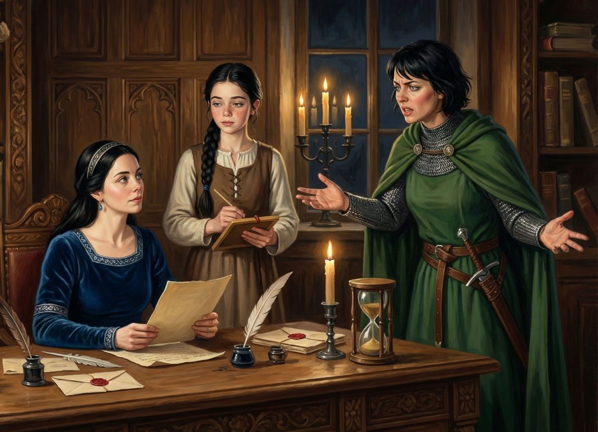 Im Arbeitszimmer der Baronin von Weidenhag herrschte eine beinahe ehrfürchtige Stille; nur das leise Kratzen der Feder durchbrach sie, wirkte wie ein vertrauter Herzschlag, der die Worte langsam ins Pergament trug. Gwidûhenna von Gugelforst war konzentriert, bereits einige Stunden lang saß sie tief versunken in ihrer Arbeit; sie las Briefe und Depeschen, schrieb Antworten darauf und siegelte diese mit Wachs und ihrem Wappen.