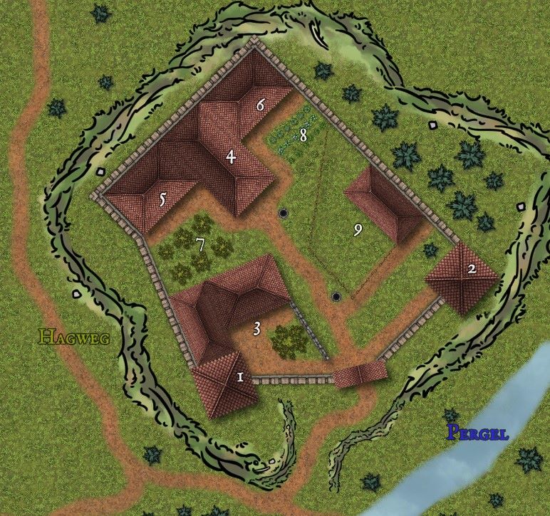 Die Klosteranlage ist von einer Bruchsteinmauer mit Wehrgang und zwei Wachtürmen umgeben - der Düsterturm (1) Hagweg-seitig und der Storchenturm (2). Rund um ersteren findet sich auch das Gutshaus, die Gesindebehausungen und der große Apfelbaum - der Herzbaum der Familie Hartungen-Düsterfurt (3). Das schwere Tor aus dem widerstandsfähigen Holz des nahen Dûrenwaldes ist seit dem letzten Orkensturm von Ruß geschwärzt. Es ist nicht bekannt, dass die Klosteranlage in den 250 Götterläufen ihres Bestehens schon jemals erobert wurde - und das trotz der immer währenden Gefahr durch Orks.