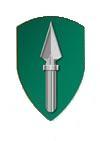Ein grüner Wappenschild mit einer senkrecht nach oben zeigenden silbernen Speerspitze.