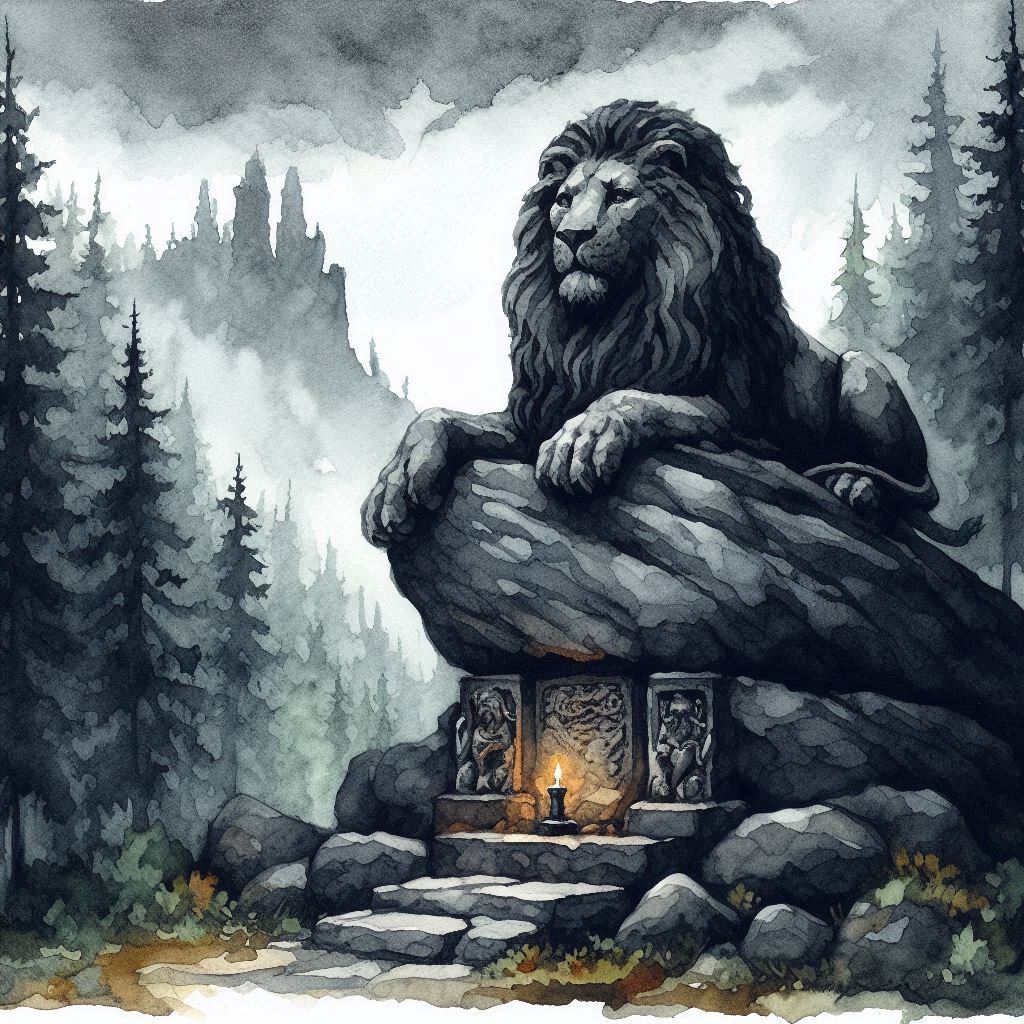 Da fügte sich der Löwe dem Wort der Donnernden und legte sich nieder. RONdra aber überzog ihn mit einem Mantel aus Stein, damit niemand die Ruhe Gwyddors störe.