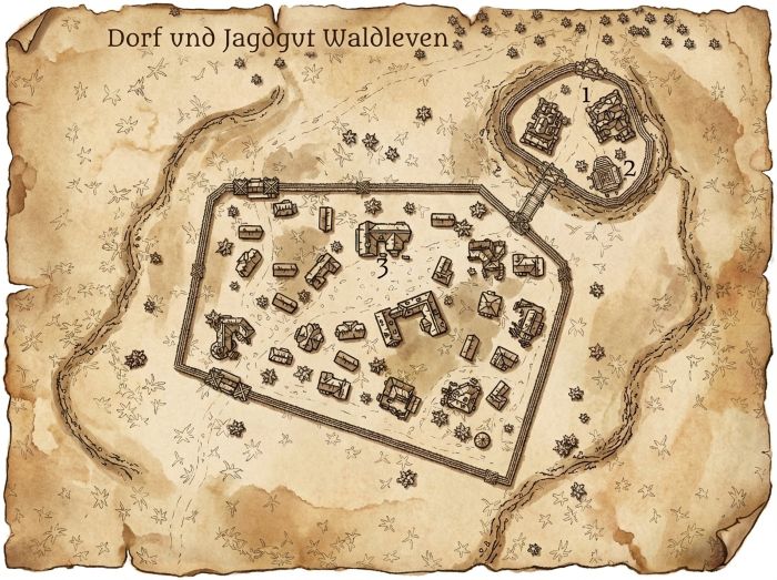 Wiewohl das Dorf stets klein und beschaulich geblieben ist kann es dennoch einen gewissen herzoglichen Glanz nicht verhehlen. Die Familie von Löwenhaupt hat hier ihr repräsentatives Jagdgut und es kommt nicht selten vor, dass innerhalb Waldleuens Grafen, Fürsten oder Herzöge mit ihrem Gefolge Halt machen um einer Einladung der herzoglichen Familie zur Firungefälligen Jagd nachzukommen. Selbst Kaiserin Rohaja soll das Dorf schon einmal beehrt haben. Auch deshalb wird stets Wert darauf gelegt, dass nicht nur das herzogliche Gut, sondern auch die einfach gehaltenen Häuser und Höfe der hier lebenden Menschen stets ansehnlich und in Schuss gehalten werden. Mittelpunkt der kleinen, aber wehrhaften Siedlung bildet, wie könnte es anders sein, das Jagdgut samt herzoglicher Hundezucht (1). Darüber hinaus finden sich hier auch noch ein Tempel des Firun (2) und mit dem “Grauen Wolf” (3) (Q:5, P:3, S:10) ein sehr annehmbares Gasthaus. Die Bewohner Waldleuens sind hohen Besuch gewohnt und auch ein Stück weit stolz darauf, dass ihr Dorf - vor allem bei hochherrschaftlichen Jagden und Banketten - eine solch hohe Bedeutung hat.