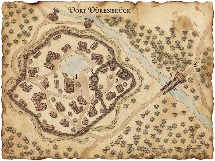 Auf dem Gebiet des einstigen Lagers Murak Horas´ Orkenzwingerlegion, genannt Erlenwald (Bosp. Alnisilva), liegt das Dorf Dûrenbrück auf einer leichten Anhöhe, eingebettet zwischen dem Dûrenwald und dem Dergelfluss und von einer rüstigen Palisade geschützt. Die letzten Hinterlassenschaften des einstigen Lagers liegen am höchsten Punkt der Ansiedlung, direkt überhalb der Brücke. Hier finden sich neben dem Gutshaus der Ritter (2) auch die eine oder andere Ruine aus längst vergangenen Tagen. Die heutigen Bewohner Dûrenbrücks leben in einfachen Häusern und Hütten aus Fachwerk und dem widerstandsfähigem Holz des nahen Forsts. Bedingt durch die Lage des Dorfes verwundert es nicht, dass der Fischfang in Reusen, neben überschaubarer Landwirtschaft und Holzhandwerk das Hauptauskommen der Bewohner sichert. Am Dorfplatz (1) befindet sich neben dem kleinen Tempel der Rondra (3) der so genannte Nussbaum, der den Dorfbewohnern deshalb als der Travia heilig gilt, weil es heißt, dass man hoffen darf, in seinen hohlen Innenräumen in den härtesten Wintern nährende Nüsse zu finden. Die in Anlehnung hieran “Zur alten Eiche” (4) (Q4/P2/S8) benannte Schenke ist der Ort des gesellschaftlichen Lebens in kalten Tagen, auch wenn das Bier recht dünn sein mag. Nahe der Dergelbrücke (5) liegt ein Schrein des Aves (6), der von Durchreisenden gerne aufgesucht wird und vor gut 20 Götterläufen von der Geweihten Alvine Nesselklamm gespendet wurde.