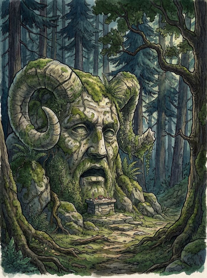 Vor einigen Jahren wurde das inzwischen verwitterte Heiligtum des Levthan im Tannenwald entdeckt. Die Darstellung zeigt einen Felsen in der Gestalt eines männlichen Menschenkopfes mit Widderhörnern.