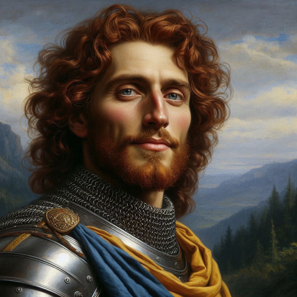 | Kurzprofil: | *1012 BF, 183 Halbfinger, schlank und athletisch gebaut, rotbraune locken, Vollbart, blaue Augen, stets gerüstet und bewaffnet; Meisterlicher Ritter voll naiver Begeisterung für Heldenepen, Waffen und Pferde, meist gut gelaunt, liebender Familienvater, geistig nicht besonders rege und dadurch ein "nützlicher Idiot" in den Händen des Grafen der Sichelwacht. |