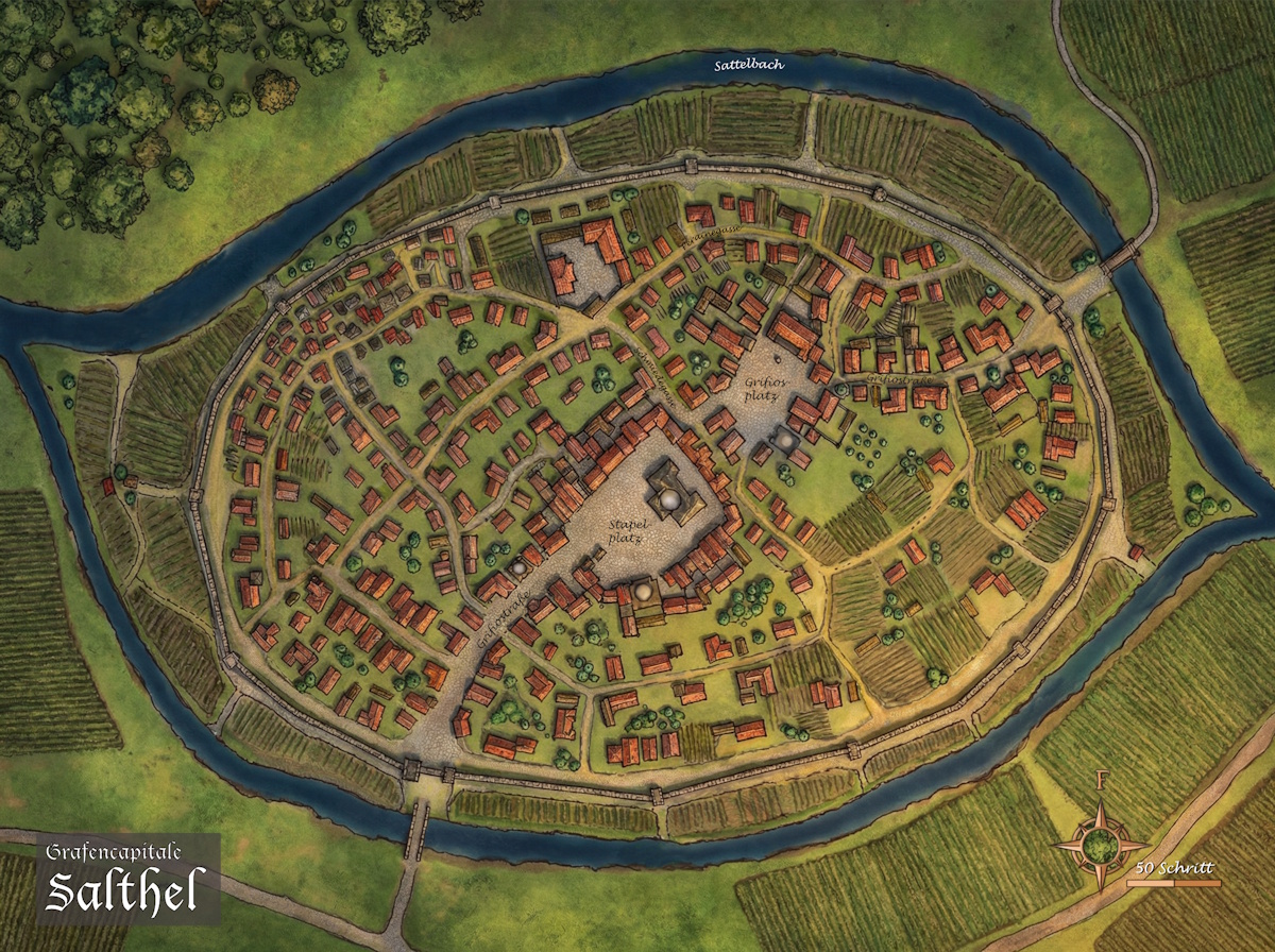 | Garnison: | 25 Stadtgardisten und Torwächter (1 Hauptmann, 3 Weibel, 21 Gardisten, organisiert in drei Rotten a acht), 6 Türmer, 4 Stadtbüttel zusätzlich auf Burg Aarkopf und in Gräflich Salthel 24 Ritter der Sichel samt Gefolge, ein Halbanner Rotröcke (persönliche Garde des Grafen) sowie auf Stadt und den nahen Weiler Traviaglück verteilt ein bis anderthalb Banner der Sichelgare (Salthelsaare/Mithridenswehr) |
