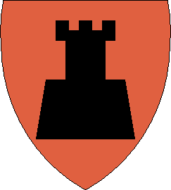 Auf kupfernem Schild in Schwarz ein zinnenbewehrter Turm auf einem Felssockel.