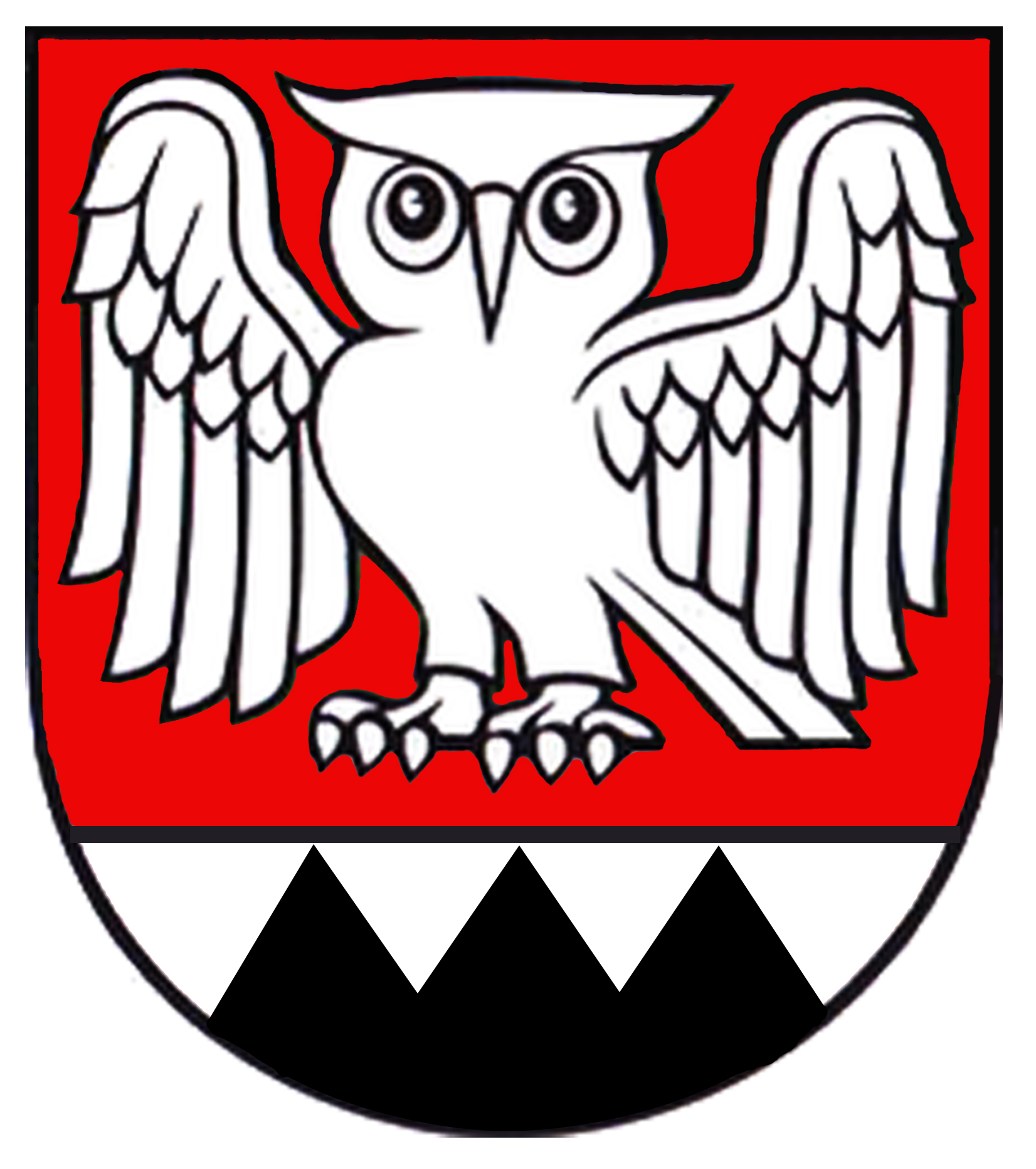 Silberne Eule auf rotem Grund über einem silbernen Schildfuß mit drei schwarzen Spitzen.