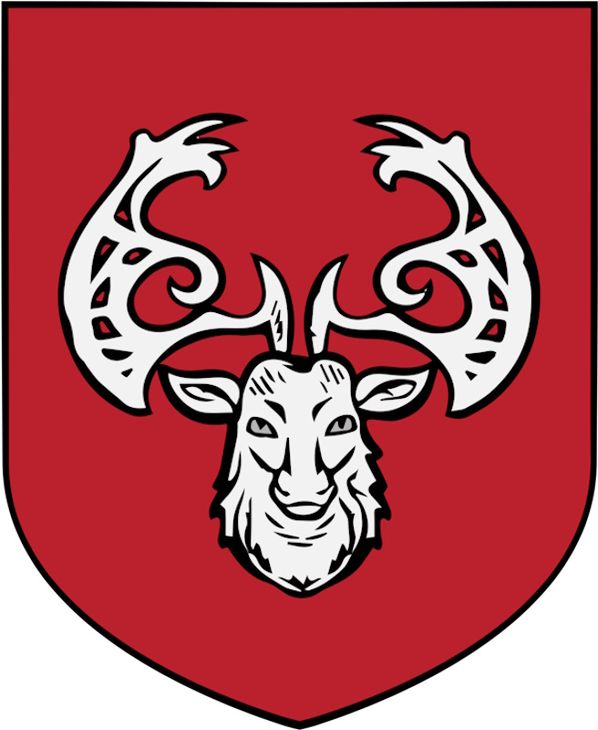 In Rot ein vorwärtsgekehrter silberner Hirschkopf mit silbernen Lichtern, bewehrt mit einem silbernen, prunvoll durchbrochenen Schaufelgeweih |